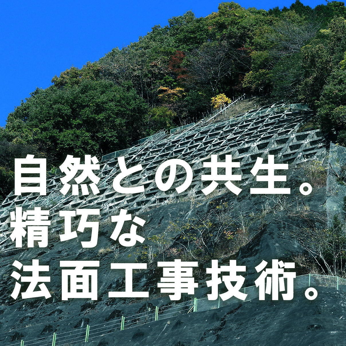 中国天龍は岡山県津山市に拠点を構える法面(のりめん)工事施工会社です。法面という言葉に聞き馴染みがない方もいるかもしれません。日本は国土の大半が山間地であるため、住宅や道路などの開発を行う際には、必ず法面と呼ばれる傾斜地が発生します。法面工事を行うことで、雨や地震による災害を防ぎ、家屋や道路、鉄道などを守る重要な役割を果たしています。